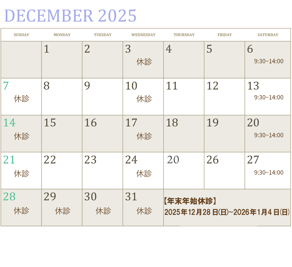 2025年12月休診日 2025.11.27お知らせ 2025年12月は、次の通り休診いたします。 毎週日曜日、水曜日、 年末年始休診:2025年12月28日(日)~2026年1月4日(日) Post Share Hatena Pocket RSS feedly Pin it お知らせ 2025年11月休診日 関連記事一覧 2023年12月休診日 2023年8月休診日 2025年8月休診日 2025年2月休診日 2024年12月休診日 2023年11月休診日 2025年1月休診日 2023年7月休診日 2025年4月休診日