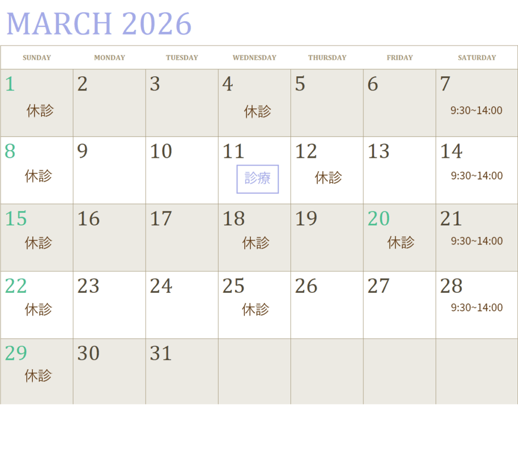 2026年3月の診療日を掲載いたしました。 2026.02.20 2026年3月は、次の通り休診いたします。 毎週日曜日・水曜日(4日・18日・25日)、12日(木)、および20日(祝日・金)を休診とさせていただきます。 なお、11日(水)は振替で診療いたします。 Post Share Hatena Pocket RSS feedly Pin it 2026年2月の診療日を掲載いたしました。 2026.02.20 2026年3月の診療日を掲載いたしました。 2026.01.28 2026年2月の診療日を掲載いたしました。 2026.01.07 2026年1月の診療日を掲載いたしました。 2025.11.27 【年末年始休診のお知らせ】2025年12月28日~2026年1月4日休診 2025.11.27 2025年12月の診療日を掲載いたしました。 2025.10.24 2025年11月の診療日を掲載いたしました。 2025.10.02 施設基準を公開いたしました 2025.09.29 2025年10月の診療日を掲載いたしました。 2025.08.27 2025年9月の診療日を掲載いたしました。 2025.07.31 2025年8月の診療日を掲載いたしました。