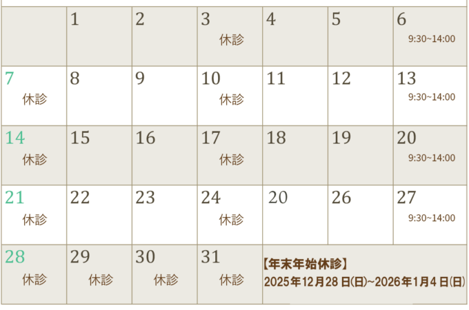 2025年12月は、次の通り休診いたします。 毎週日曜日、水曜日、 年末年始休診:2025年12月28日(日)~2026年1月4日...